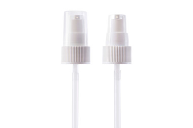 This 20/410 White Treatment Pump is made out of polypropylene plastic and has a ribbed finish. On the top is a clear plastic over cap to prevent any accidental dispensing while on the go. It has a 3.5" dip tub length and more precise dispensing when compared to a saddle pump. Use it for creams and lotions. Â It is compatible with a container that has a 20 mm opening and a 410 finish. This Treament Pump is sold individually/eaches.